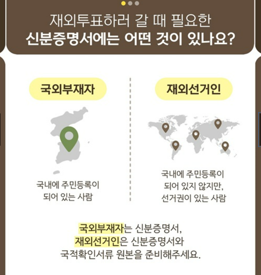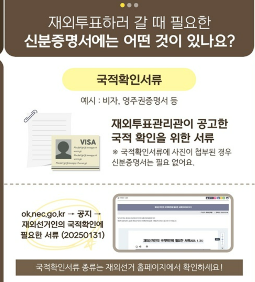 재외선거인은 대한민국 국적을 유지하고 있다는 것을 입증해야 하기 때문에, 신분증 외에 ‘국적확인서류’ 원본이 필요합니다.