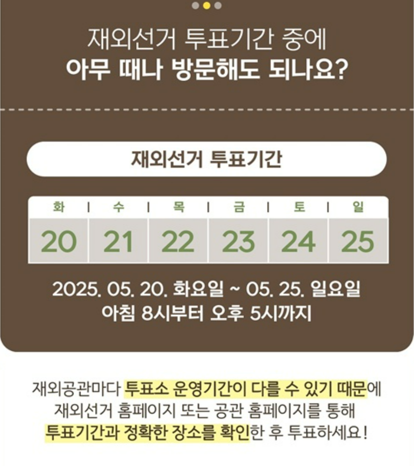 재외선거(재외국민 투표)는 2025년 5월 20일(화)부터 5월 25일(일)까지, 오전 8시~오후 5시까지입니다.