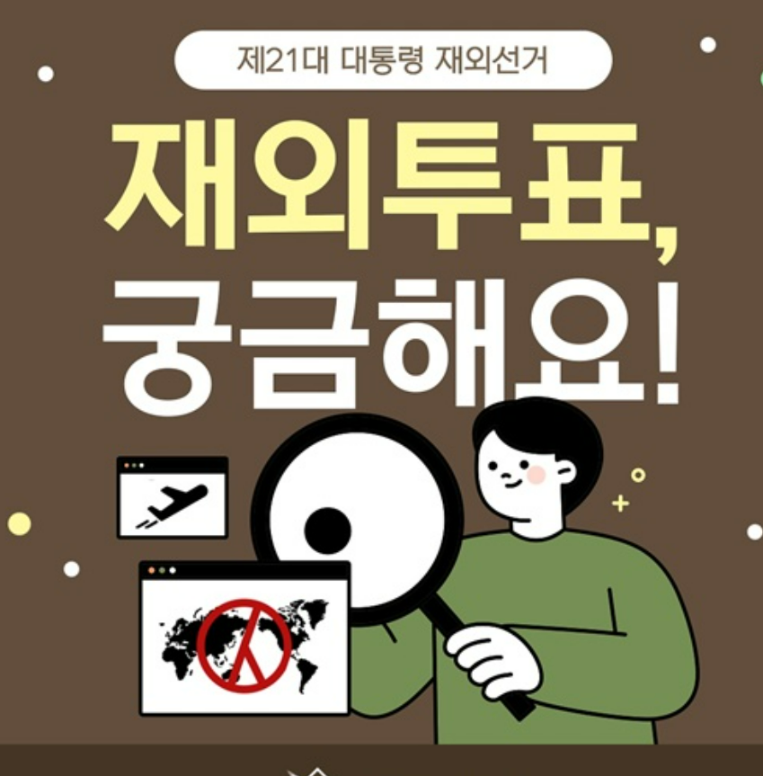 재외선거(재외국민 투표)는 해외에 거주하거나 체류 중인 대한민국 국민이 대한민국의 주요 선거(대통령선거, 국회의원선거 등)에 참여할 수 있도록 마련된 제도이므로 해당되시는 분들은 반드시 확인해보시기 바랍니다.