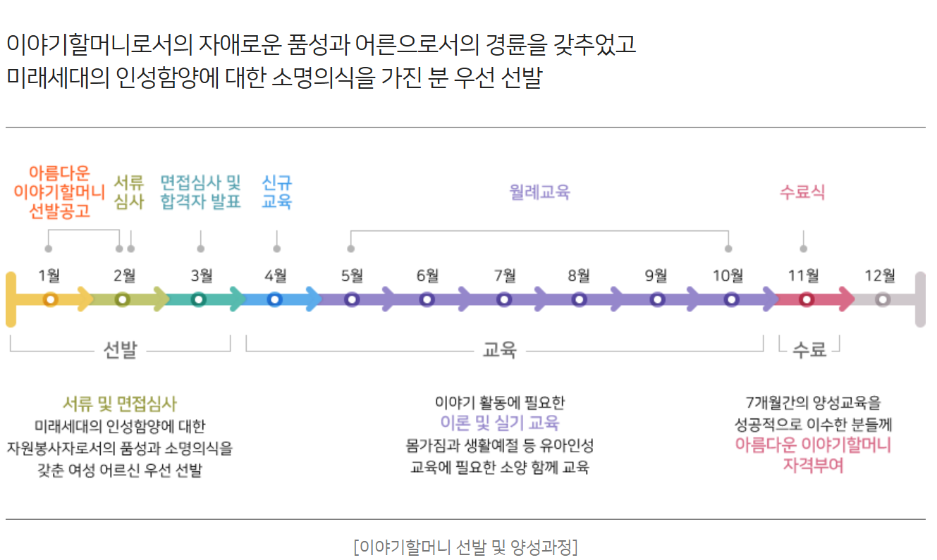 합격자는 60시간 이상의 교육 과정을 수료해야 합니다. 여기에는 구연 기법, 아동 발달 심리, 전래동화 이해, 이야기 나눔 기술 등이 포함됩니다. - 최종 배치 및 활동 시작