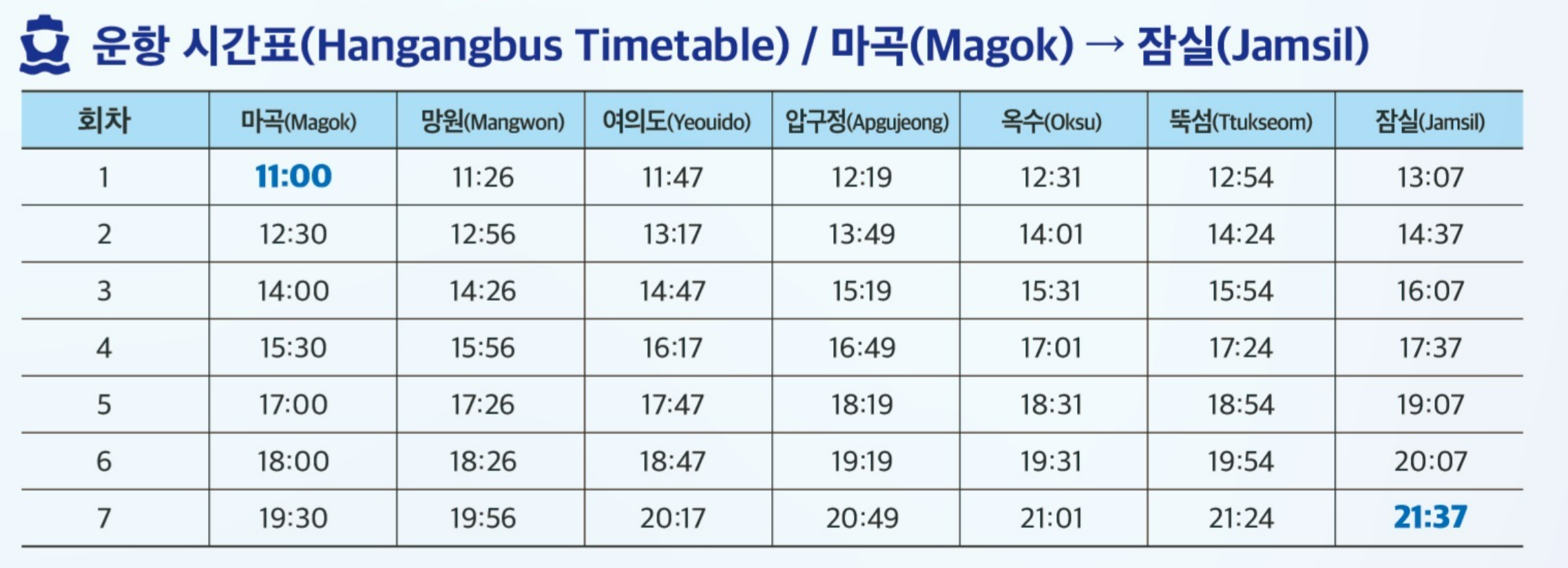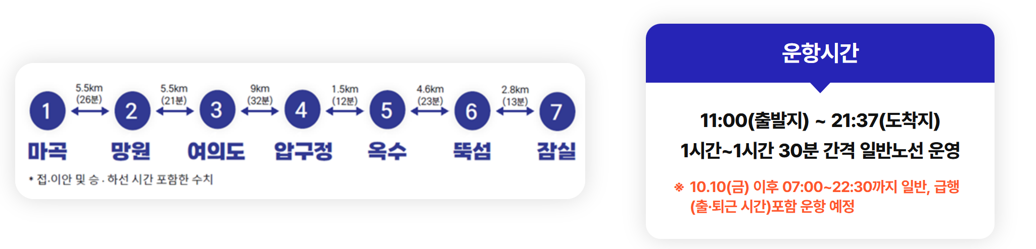 이어 2025년 10월 10일부터는 운행 시간이 대폭 확대됩니다. 평일과 주말 모두 오전 7시부터 오후 10시 30분까지 운영되며, 평일 기준 하루 왕복 30회 운항이 이루어집니다.