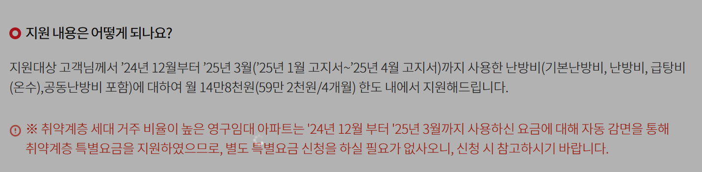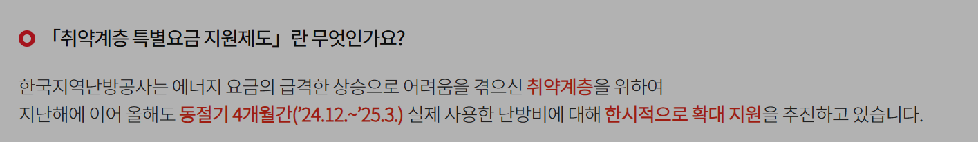 한국지역난방공사는 매년 동절기 난방비 부담을 덜어주기 위해 ‘취약계층 특별요금 지원제도’를 운영하고 있습니다.