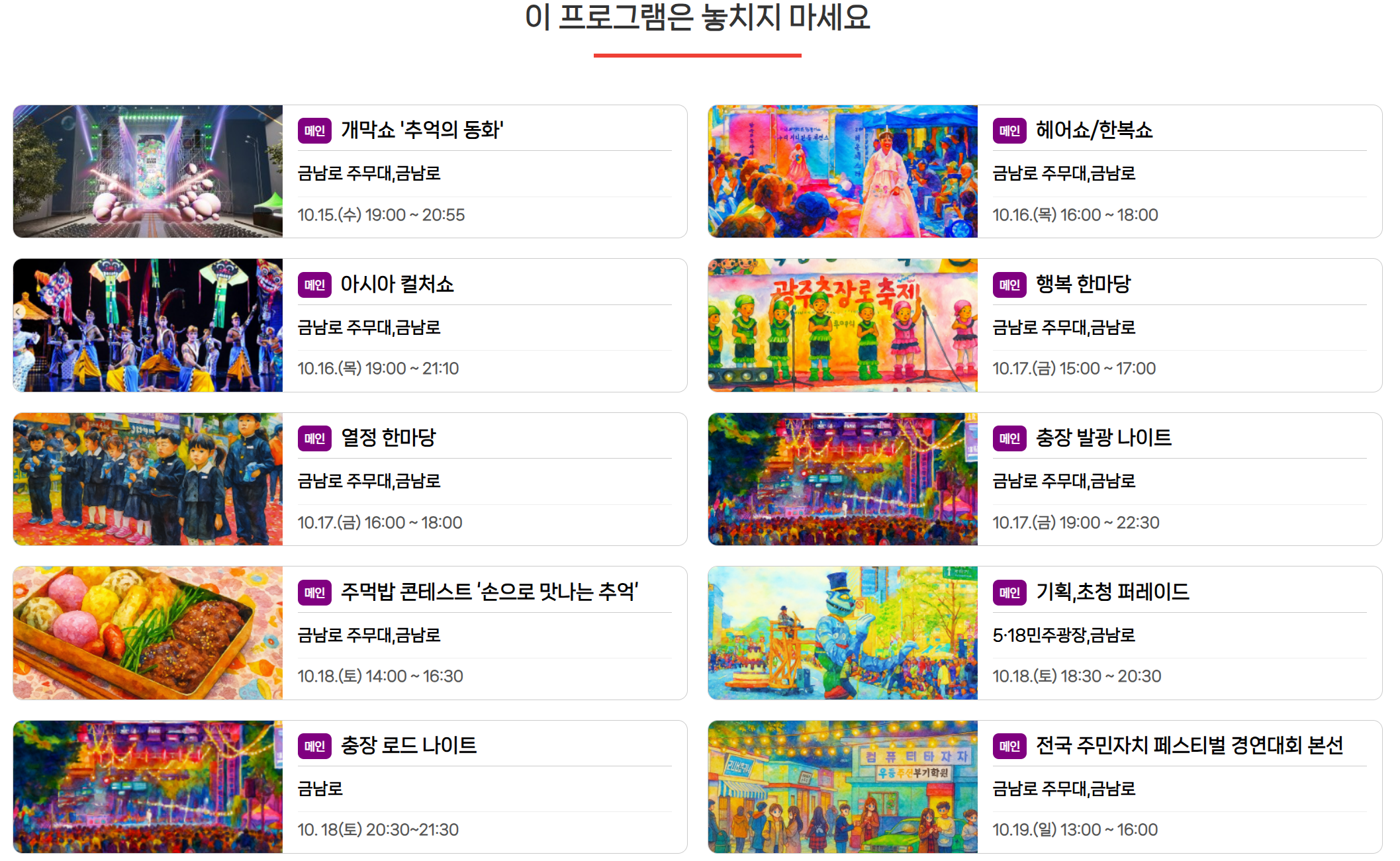 충장축제 주요 프로그램은 주말과 저녁 시간대에 몰려 있으므로, 낮에는 거리 체험과 전시 중심 구간을 먼저 관람하고, 오후~야간에 공연 위주 구간으로 이동하는 동선을 추천드립니다.