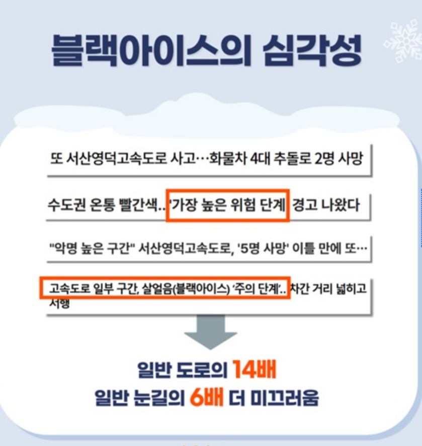 속도가 빠를수록 블랙아이스 구간에서의 사고는 치명적인 대형 사고로 이어질 가능성이 큽니다.