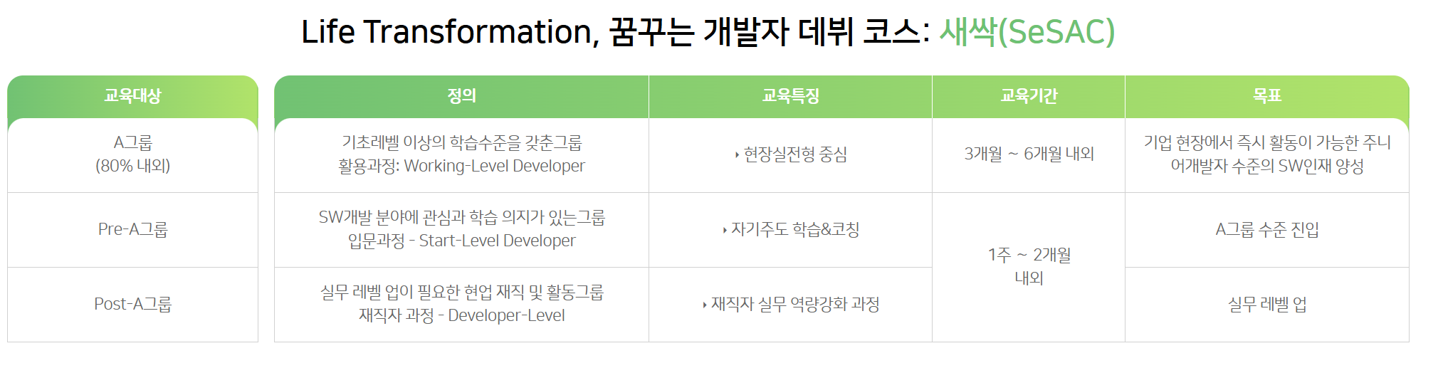 | 청년취업사관학교 | 지역 기반 “부트캠프” | 프로젝트 중심, 전액 무료 + 훈련수당 | 만 18~34세 미취업 청년 |