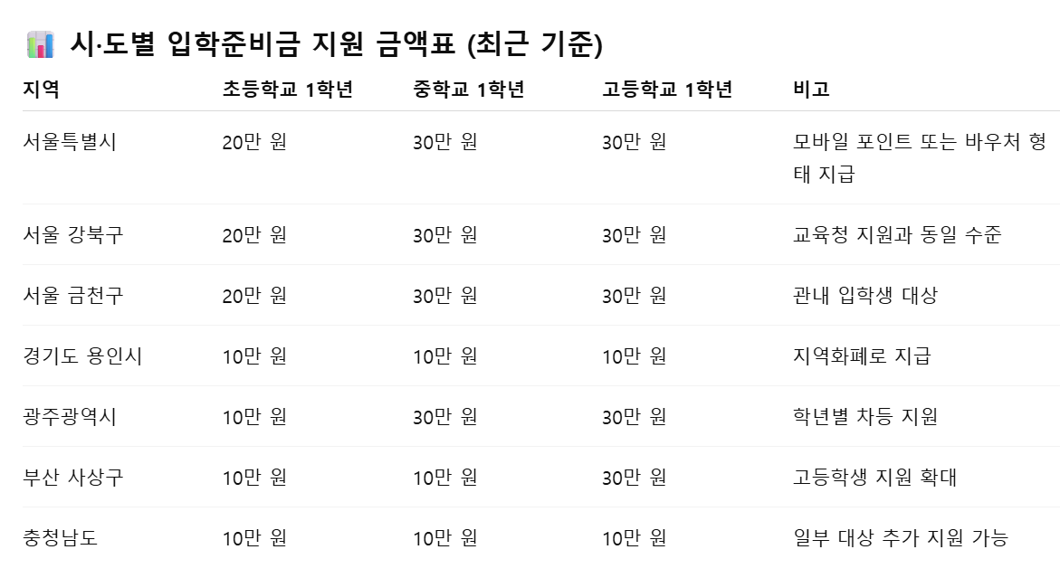 이들 지역은 중학교 입학생 중심으로 입학준비금을 운영하며, 지역별로 지원 금액과 사용 항목에 차이가 있습니다. 일부 지역은 교복 구입에 한정되는 경우도 있으므로 사용 범위를 반드시 확인해야 합니다.