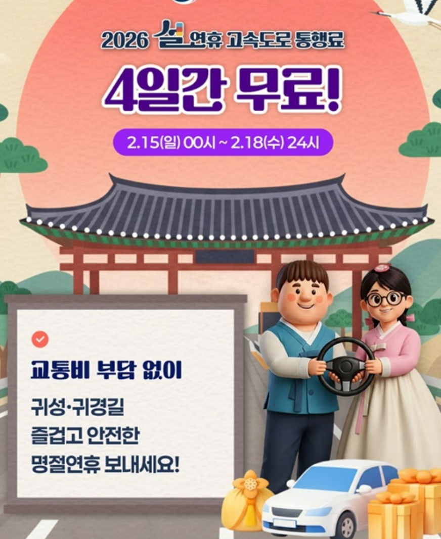 명절은 이동도 중요하지만 무엇보다 안전이 최우선입니다. 설날 고속도로 통행료 면제제도로 통행료 부담 없이, 보다 여유 있고 안전한 설 연휴 보내시기 바랍니다.